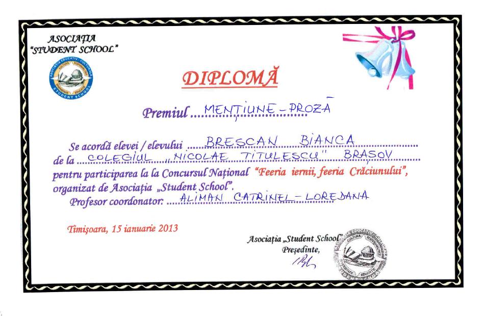 38 | Nicolae Bianca Ioana | Limba și literatura română | Proiect județean Schimb de povești despre școlile noastre, ediția a IV-a, Buzău, sectiunea proză | Premiul III | 2020 |